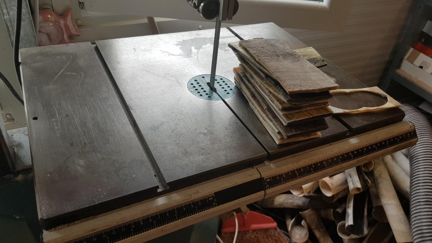 A termékek sablonját rárajzoljuk a lapokra, körbefűrészelve , csiszolások 4 szer, majd polírozzuk egy speciálisan a szaruhoz kifejlesztett pasztával bekent krepp anyagból készült koronggal.